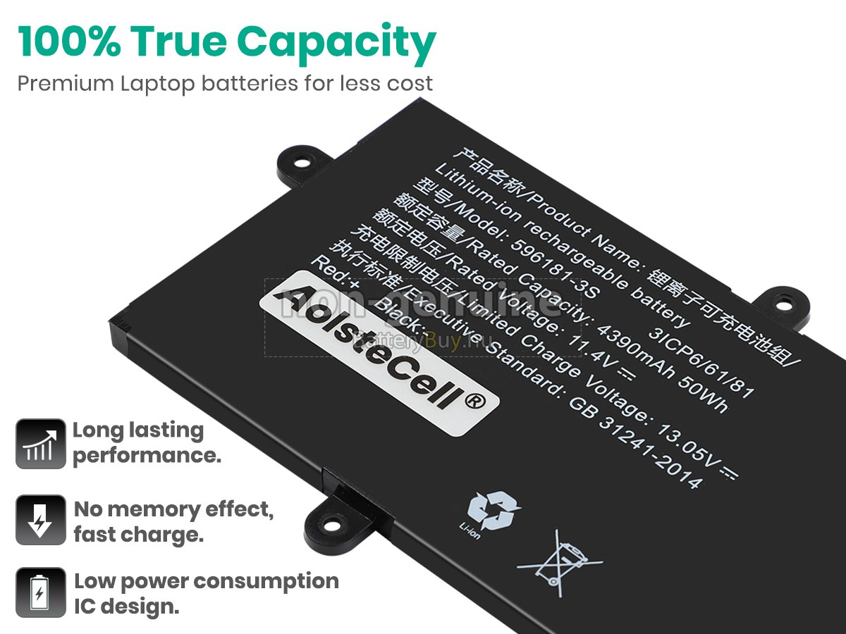 - 3 A AolsteCell 596181-3S akku 1:1 arányban lett tervezve, és mindenben megegyezik az eredeti akkumulátorral, így 100%-os kompatibilitást biztosít. Eredeti áramkör kialakítással, független védelmi áramkörrel, amely védelmet nyújt túltöltés, túlterhelés, túláram, magas hőmérséklet és rövidzárlat esetén.