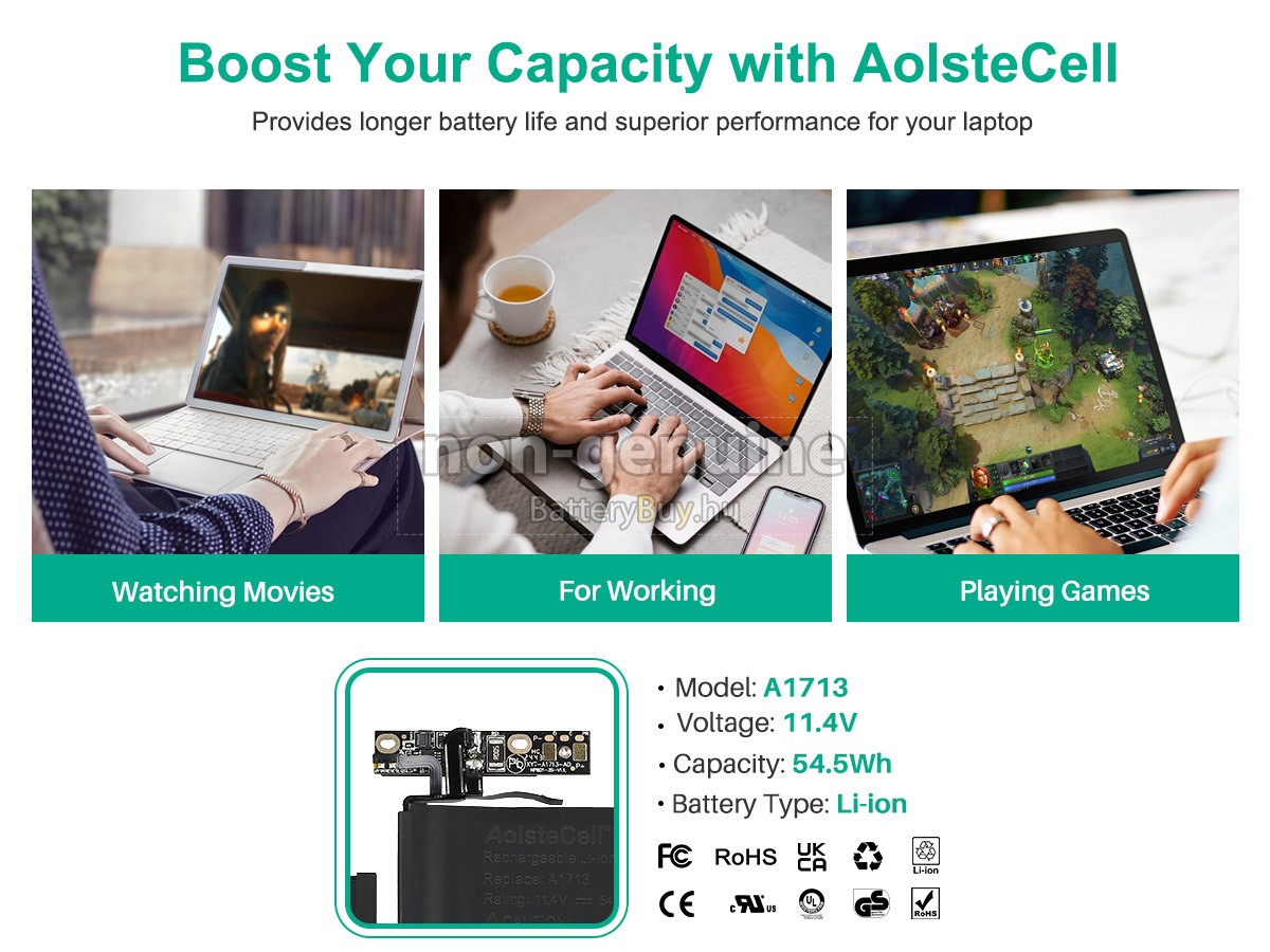 - 3 A Apple MacBook Pro Core I5 2.0 13 inch A1708(Late 2016) akku 1:1 arányban lett tervezve, és mindenben megegyezik az eredeti akkumulátorral, így 100%-os kompatibilitást biztosít. Eredeti áramkör kialakítással, független védelmi áramkörrel, amely védelmet nyújt túltöltés, túlterhelés, túláram, magas hőmérséklet és rövidzárlat esetén.