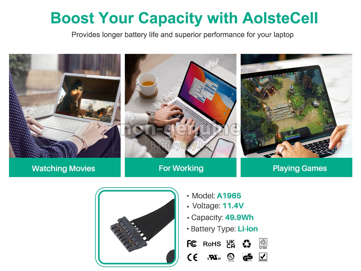 - 3 A Apple MVFH2LL/A akku 1:1 arányban lett tervezve, és mindenben megegyezik az eredeti akkumulátorral, így 100%-os kompatibilitást biztosít. Eredeti áramkör kialakítással, független védelmi áramkörrel, amely védelmet nyújt túltöltés, túlterhelés, túláram, magas hőmérséklet és rövidzárlat esetén.