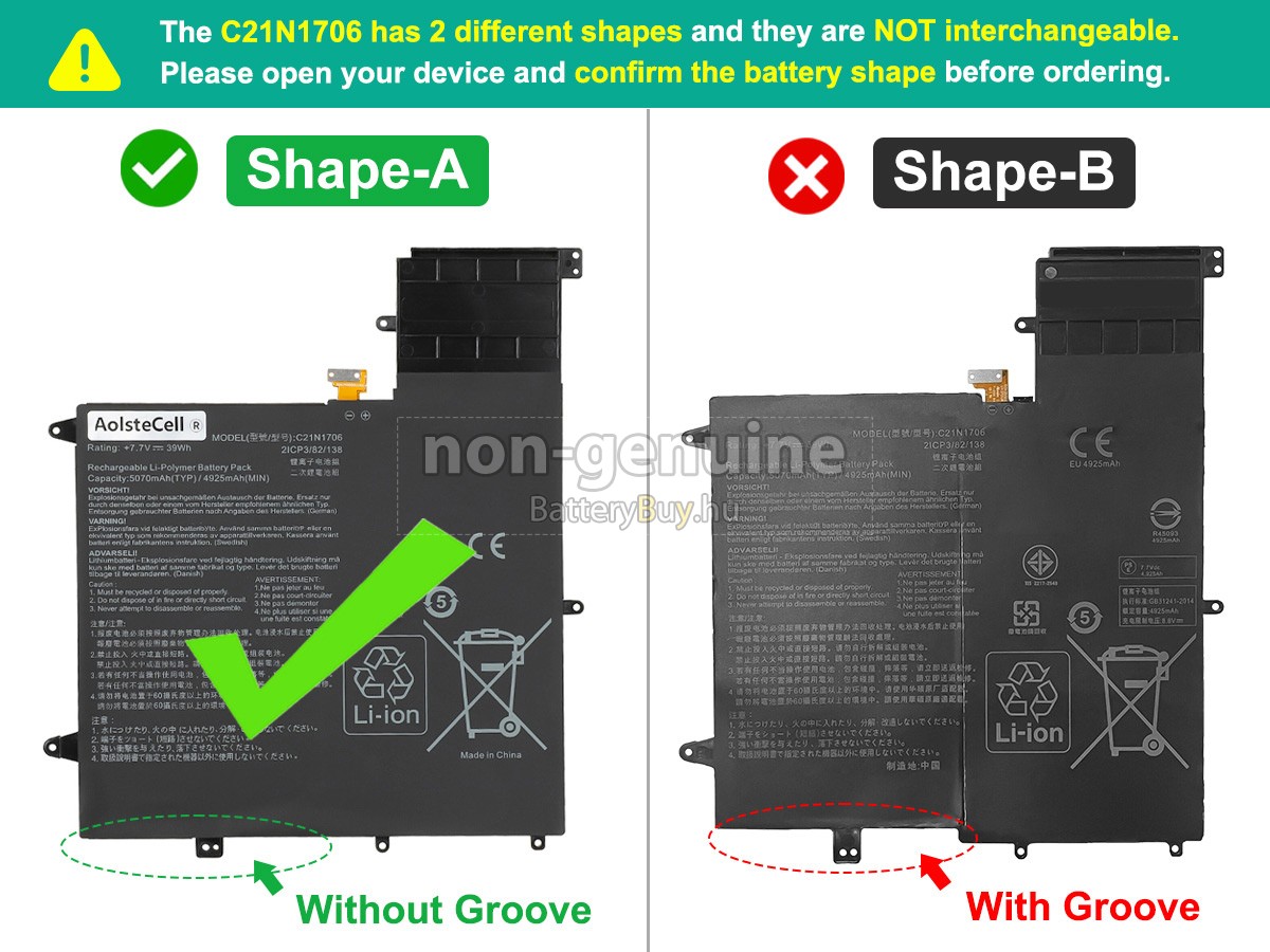 - 3 A Asus C21N1706 akku 1:1 arányban lett tervezve, és mindenben megegyezik az eredeti akkumulátorral, így 100%-os kompatibilitást biztosít. Eredeti áramkör kialakítással, független védelmi áramkörrel, amely védelmet nyújt túltöltés, túlterhelés, túláram, magas hőmérséklet és rövidzárlat esetén.