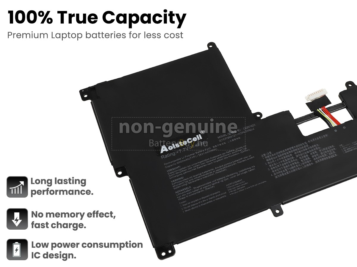 - Az Asus C22N1623 akkumulátor szerint 1: 1 arányosan tervezik, és mindenben megegyezik az eredetivel, 100%-os kompatibilis. Eredeti áramkör tervezése, független védelmi áramkör, túltöltés, túlterhelés, túláram, magas hőmérséklet és rövidzárlat védelme.