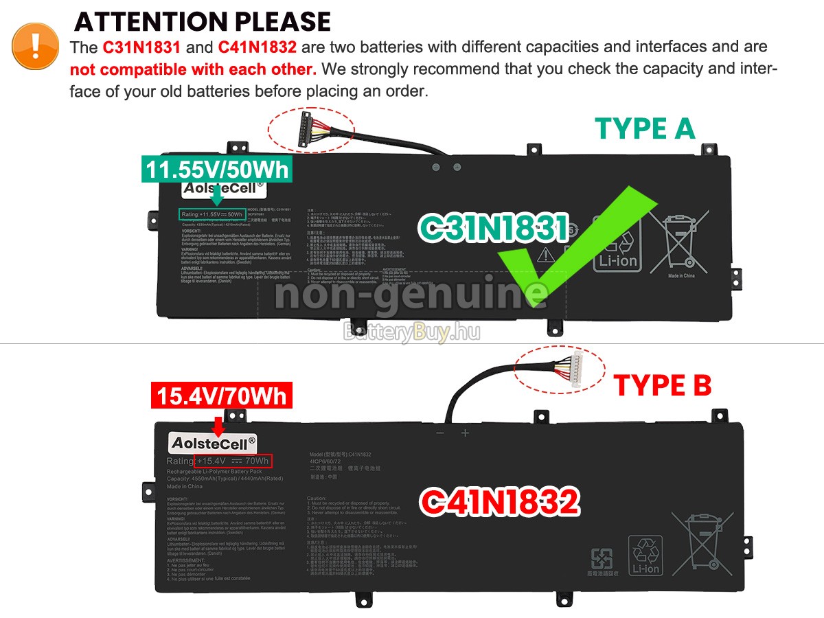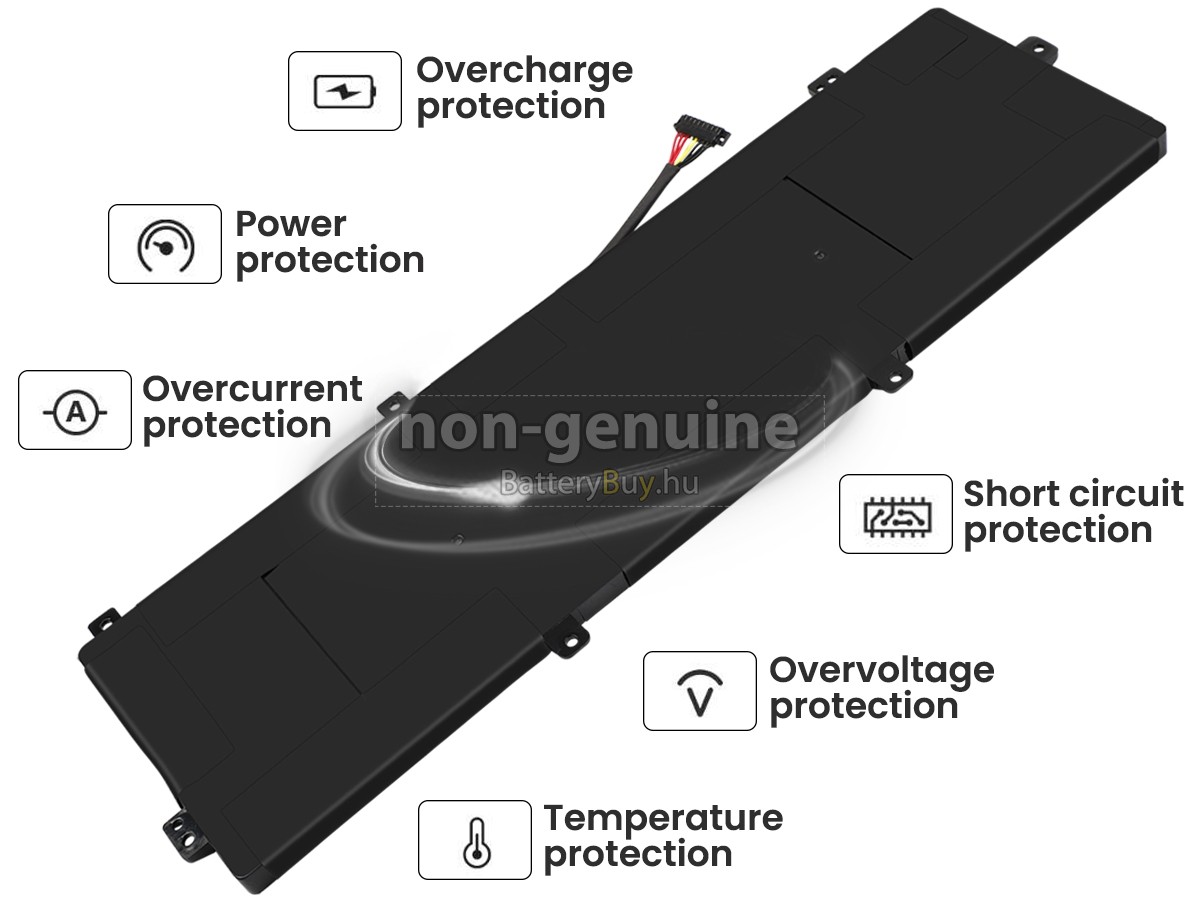 - 3 A Asus C41N1832 akku 1:1 arányban lett tervezve, és mindenben megegyezik az eredeti akkumulátorral, így 100%-os kompatibilitást biztosít. Eredeti áramkör kialakítással, független védelmi áramkörrel, amely védelmet nyújt túltöltés, túlterhelés, túláram, magas hőmérséklet és rövidzárlat esetén.