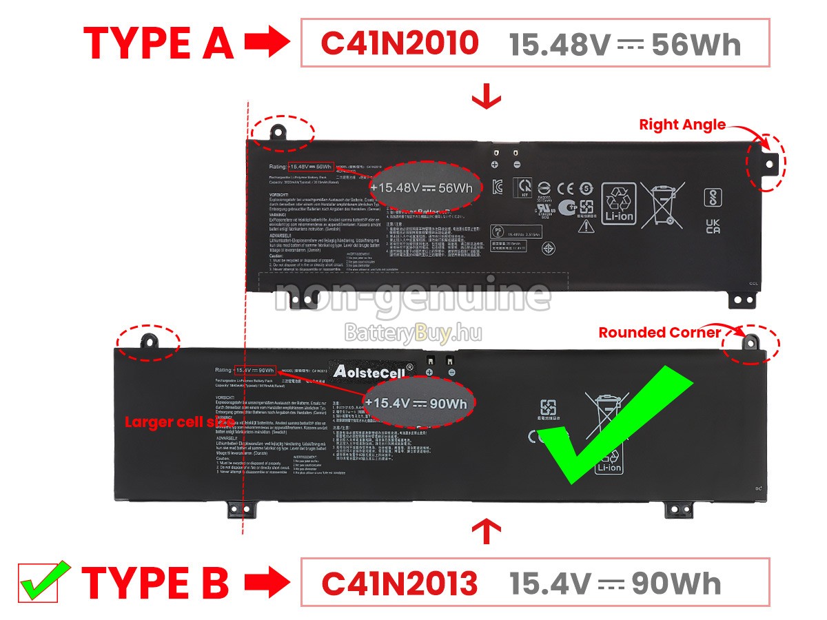 - Az Asus TUF GAMING A15 FA507RC-HN047 akkumulátor szerint 1: 1 arányosan tervezik, és mindenben megegyezik az eredetivel, 100%-os kompatibilis. Eredeti áramkör tervezése, független védelmi áramkör, túltöltés, túlterhelés, túláram, magas hőmérséklet és rövidzárlat védelme.