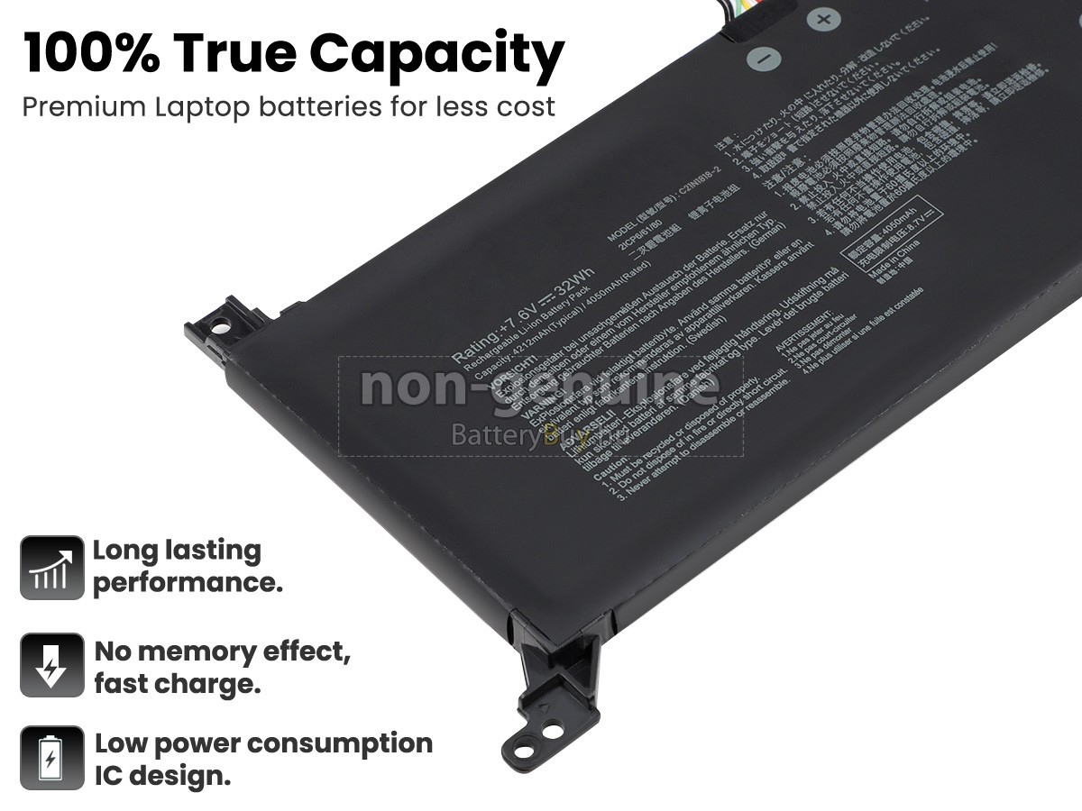- Az Asus VivoBook 14 F409BA akkumulátor szerint 1: 1 arányosan tervezik, és mindenben megegyezik az eredetivel, 100%-os kompatibilis. Eredeti áramkör tervezése, független védelmi áramkör, túltöltés, túlterhelés, túláram, magas hőmérséklet és rövidzárlat védelme.