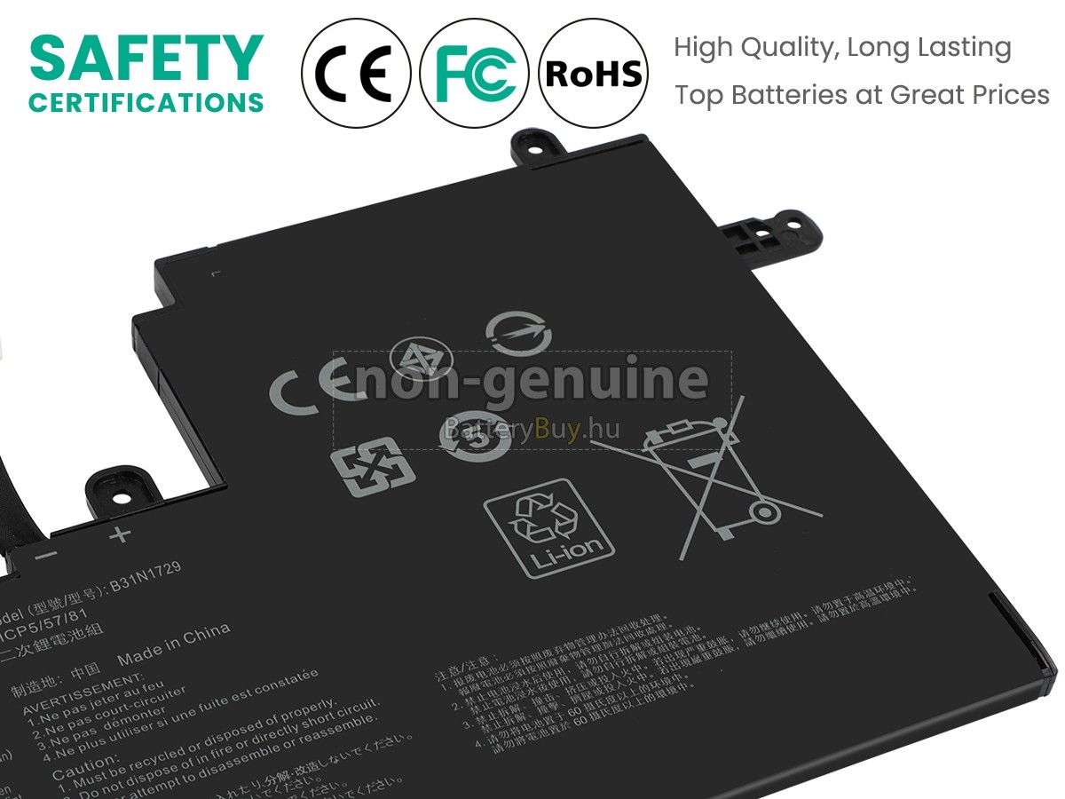 - 3 A Asus VivoBook X530UF-1G akku 1:1 arányban lett tervezve, és mindenben megegyezik az eredeti akkumulátorral, így 100%-os kompatibilitást biztosít. Eredeti áramkör kialakítással, független védelmi áramkörrel, amely védelmet nyújt túltöltés, túlterhelés, túláram, magas hőmérséklet és rövidzárlat esetén.