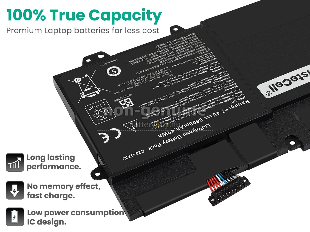 - 3 A Asus ZenBook UX32VD akku 1:1 arányban lett tervezve, és mindenben megegyezik az eredeti akkumulátorral, így 100%-os kompatibilitást biztosít. Eredeti áramkör kialakítással, független védelmi áramkörrel, amely védelmet nyújt túltöltés, túlterhelés, túláram, magas hőmérséklet és rövidzárlat esetén.