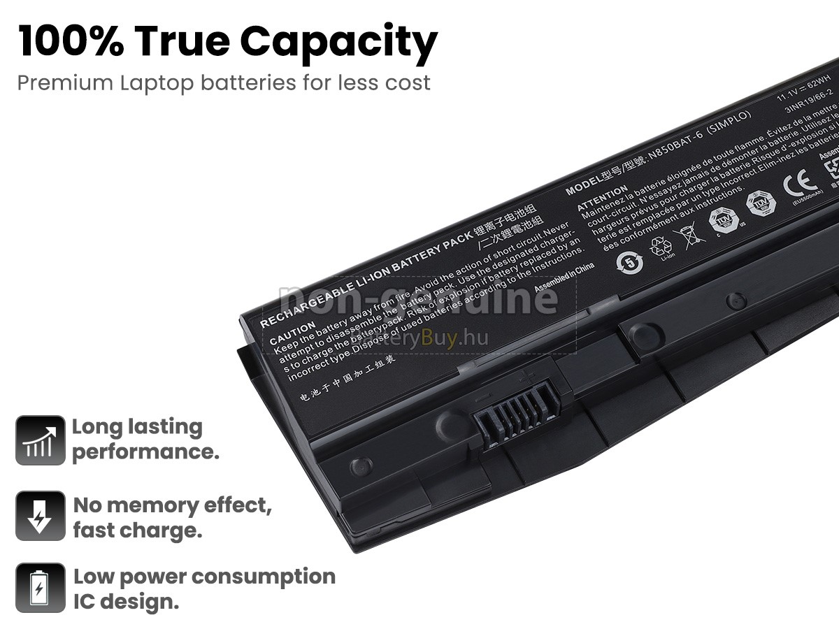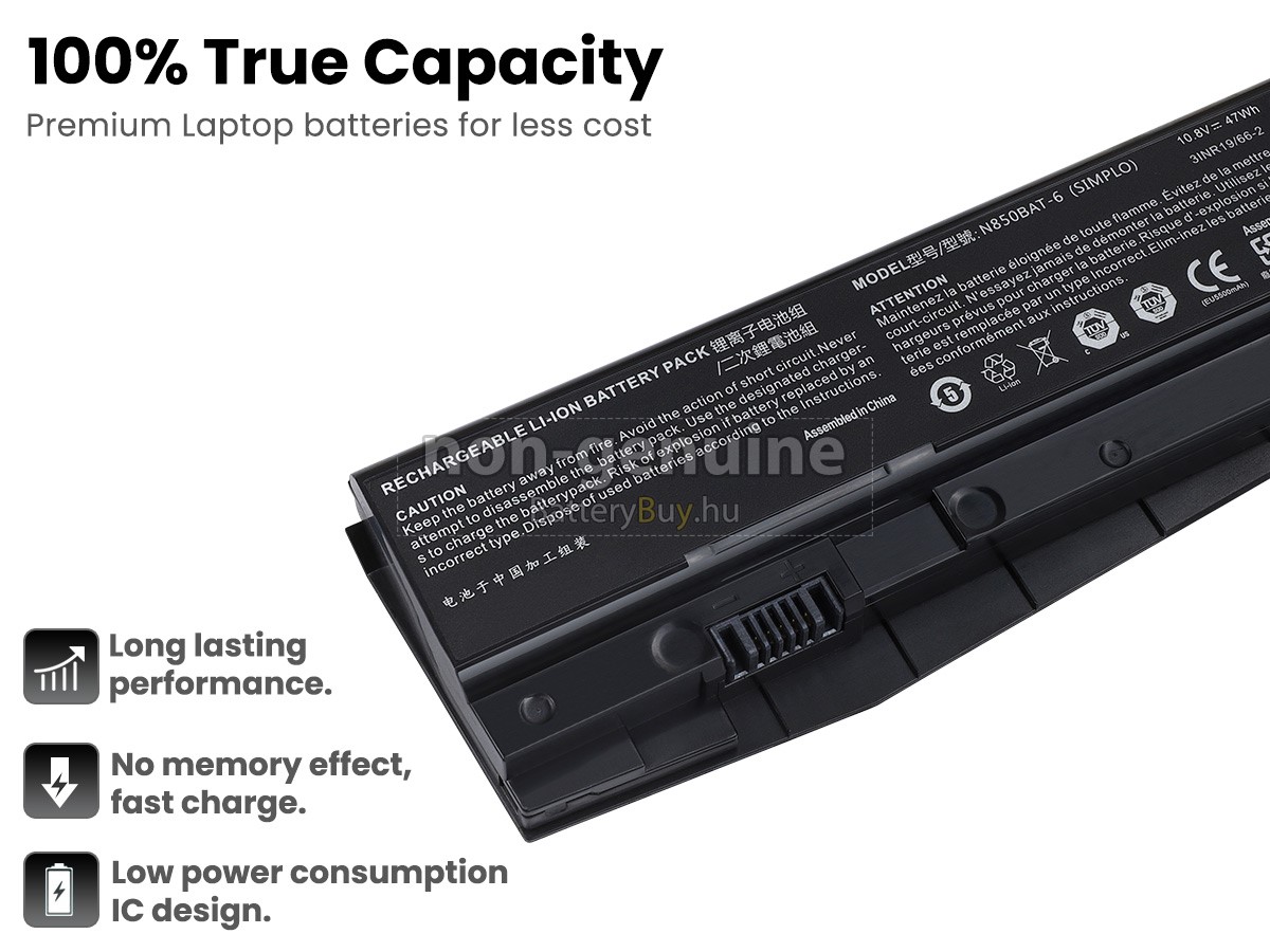 - 3 A Clevo N850HN akku 1:1 arányban lett tervezve, és mindenben megegyezik az eredeti akkumulátorral, így 100%-os kompatibilitást biztosít. Eredeti áramkör kialakítással, független védelmi áramkörrel, amely védelmet nyújt túltöltés, túlterhelés, túláram, magas hőmérséklet és rövidzárlat esetén.