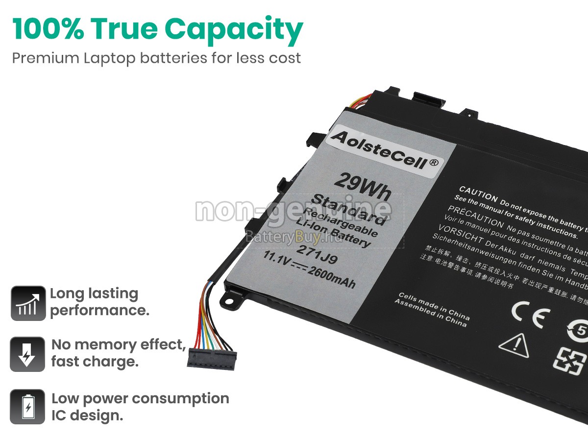 - 1 Mindegyik Dell 0271J9 akkumulátor kiváló minőségű, teljesen új lítium-ion cellákból készült, amelyeket közvetlenül a gyártó biztosít. Alacsonyabb ár, de hosszabb élettartam.