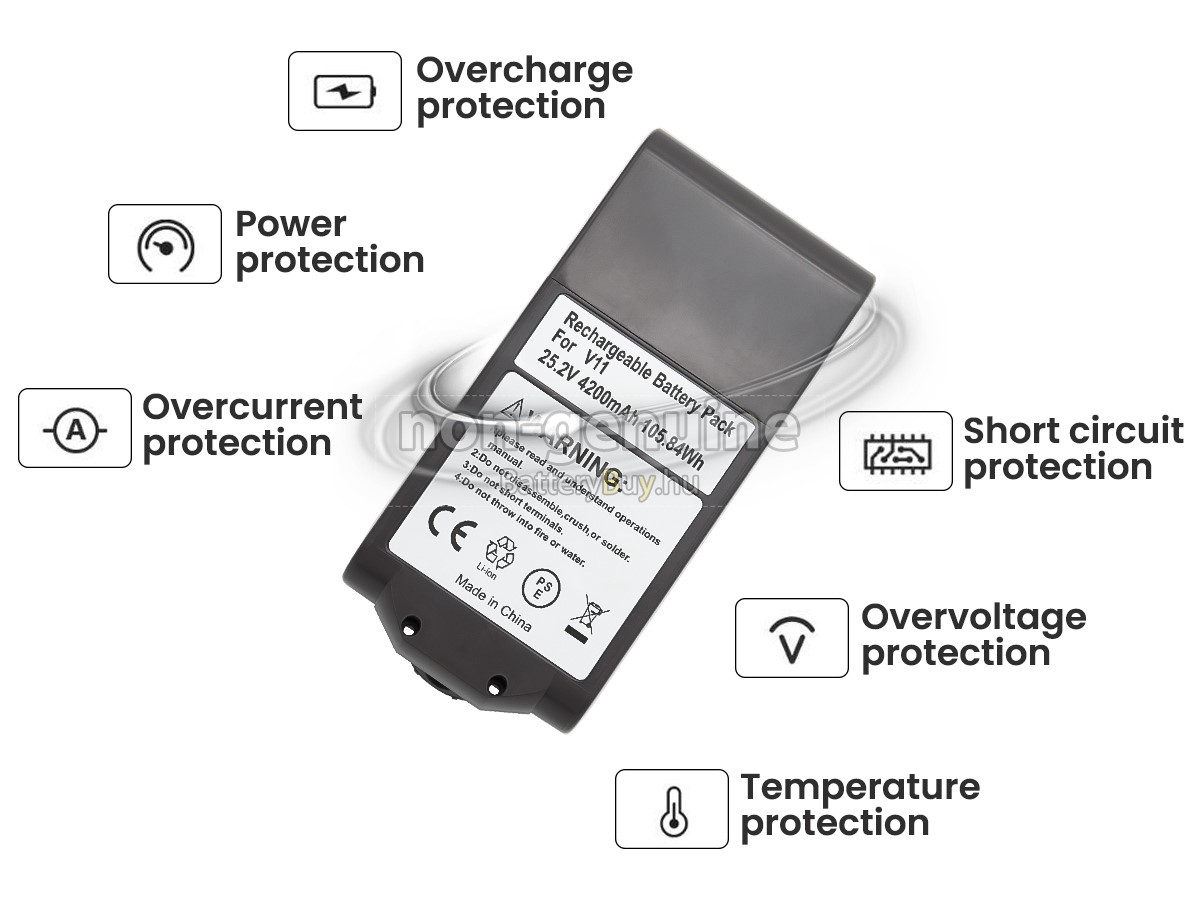 - Az Dyson SV14 V11 ABSOLUTE EXTRA porszívó akkumulátor szerint 1: 1 arányosan tervezik, és mindenben megegyezik az eredetivel, 100%-os kompatibilis. Eredeti áramkör tervezése, független védelmi áramkör, túltöltés, túlterhelés, túláram, magas hőmérséklet és rövidzárlat védelme.