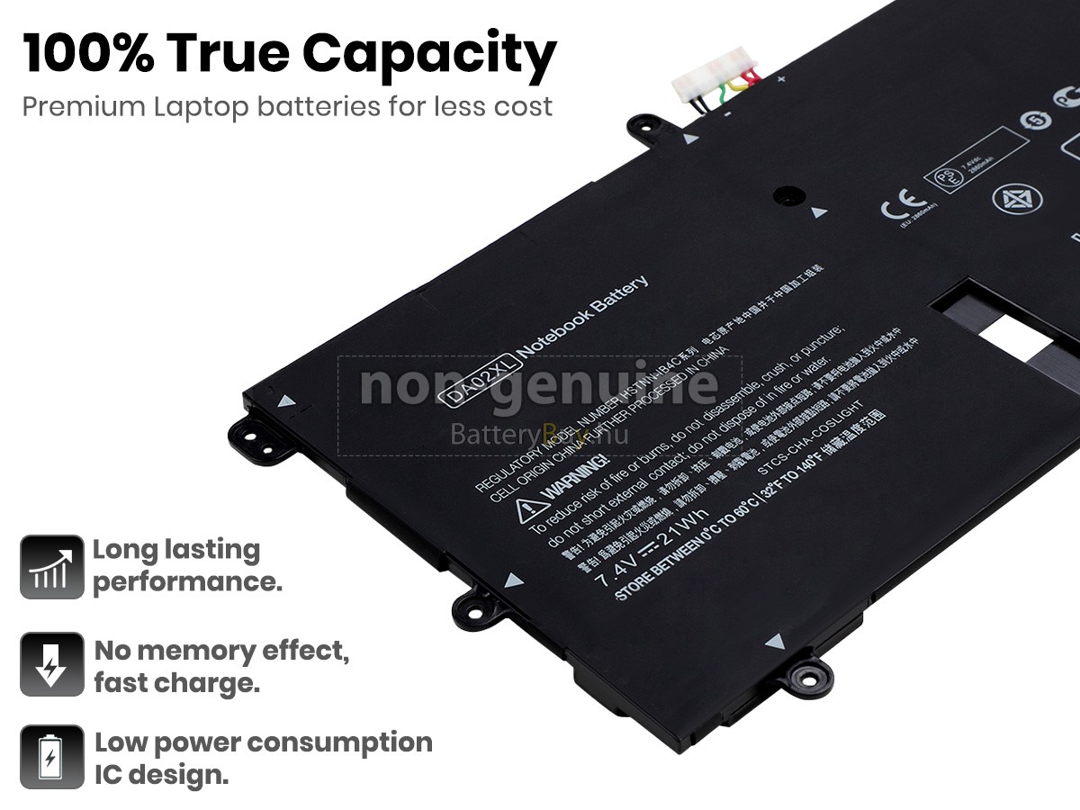 - Az HP DA02XL akkumulátor szerint 1: 1 arányosan tervezik, és mindenben megegyezik az eredetivel, 100%-os kompatibilis. Eredeti áramkör tervezése, független védelmi áramkör, túltöltés, túlterhelés, túláram, magas hőmérséklet és rövidzárlat védelme.
