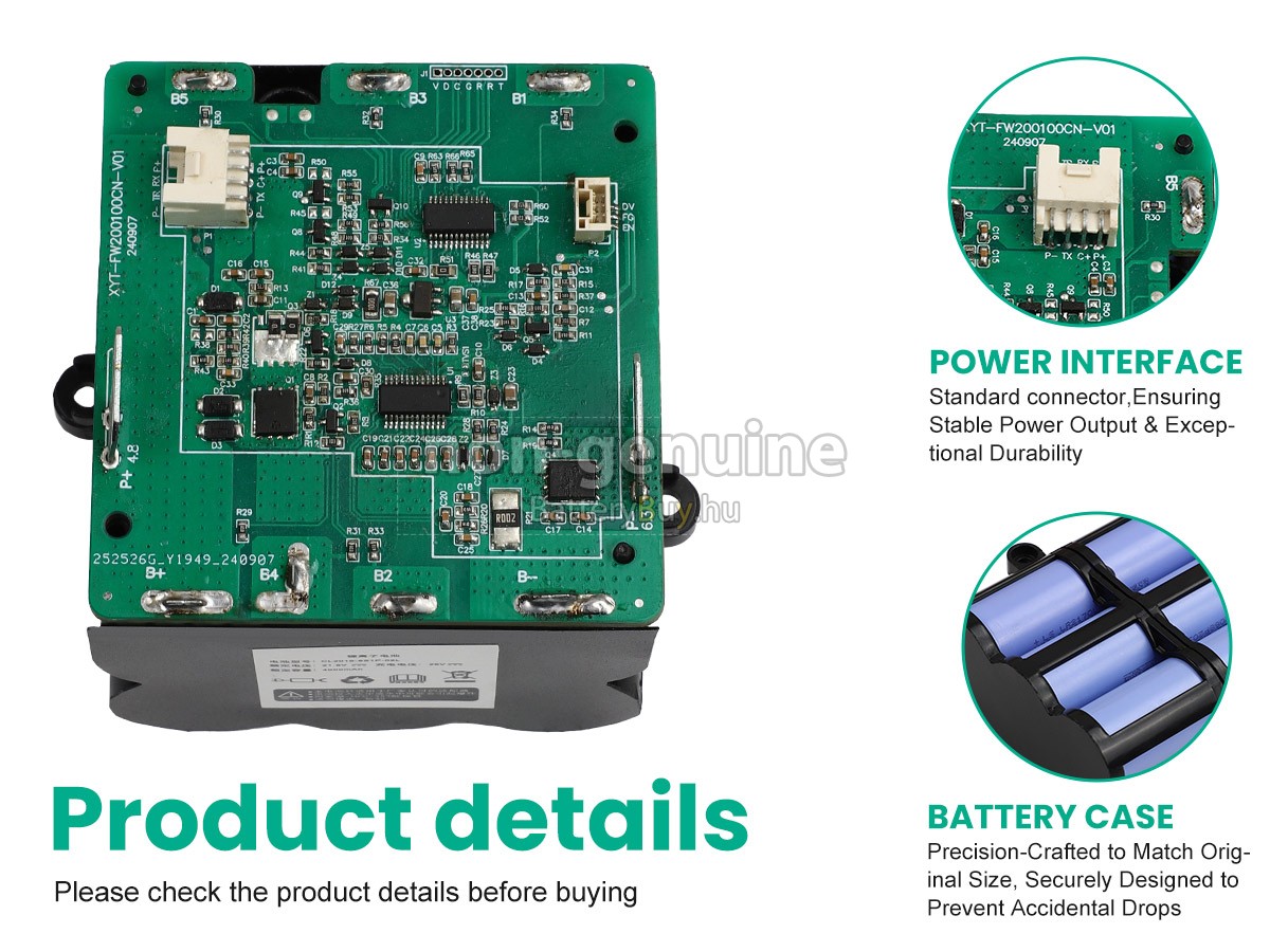 - 3 Az Tineco FLOOR ONE S5 porszívó akkumulátor szerint 1: 1 arányosan tervezik, és mindenben megegyezik az eredetivel, 100%-os kompatibilis. Eredeti áramkör tervezése, független védelmi áramkör, túltöltés, túlterhelés, túláram, magas hőmérséklet és rövidzárlat védelme.