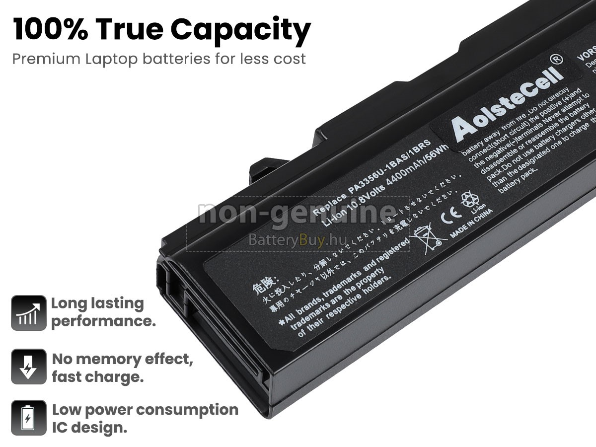 - Az Toshiba PA3356U-2BAS akkumulátor szerint 1: 1 arányosan tervezik, és mindenben megegyezik az eredetivel, 100%-os kompatibilis. Eredeti áramkör tervezése, független védelmi áramkör, túltöltés, túlterhelés, túláram, magas hőmérséklet és rövidzárlat védelme.